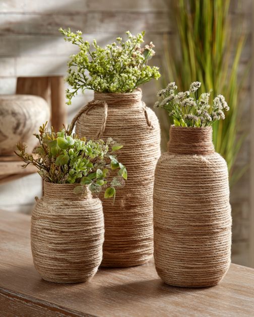 These twine-wrapped vases complement various interior design styles, particularly rustic, farmhouse, or bohemian themes. You can display them on a mantel, sideboard, or dining table as a centerpiece. Pair them with natural elements like wooden trays, dried flowers, or fresh greenery to enhance their earthy appeal. They also work well in a minimalistic setting, providing texture and warmth to the space.