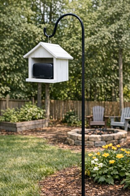 This DIY project seamlessly integrates into any garden or outdoor setting, especially those with a rustic or cottage-style aesthetic. The classic white birdhouse complements a variety of garden plants and flowers, while the sleek black metal shepherd hook adds a modern touch. The white and black color scheme is versatile, allowing for easy coordination with existing outdoor decor. Functionally, it serves as an unobtrusive speaker holder, providing a hidden sound system for outdoor gatherings or personal enjoyment.