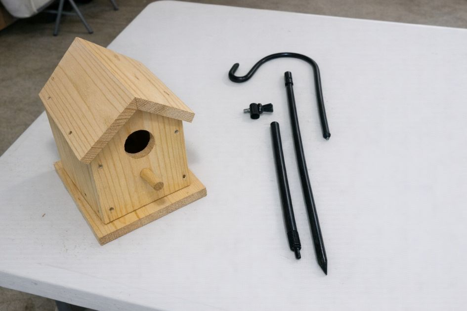 5. Secure the birdhouse onto the shepherd hook using screws, ensuring it is stable and won't tip over or detach.