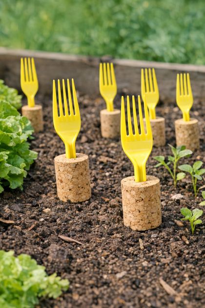 For variations, consider swapping the bright yellow forks for other vibrant colors to match your garden's theme, such as blue or red. Alternatively, use biodegradable forks for an eco-friendly option. Adapt the design by cutting the fork handles to different lengths for varied heights, which can accommodate taller plants or create a tiered visual effect. In colder climates, consider using metal forks painted in bright colors, as they can withstand frost better than plastic. For specific plants like strawberries, space the forks closely to better protect the fruit from birds.