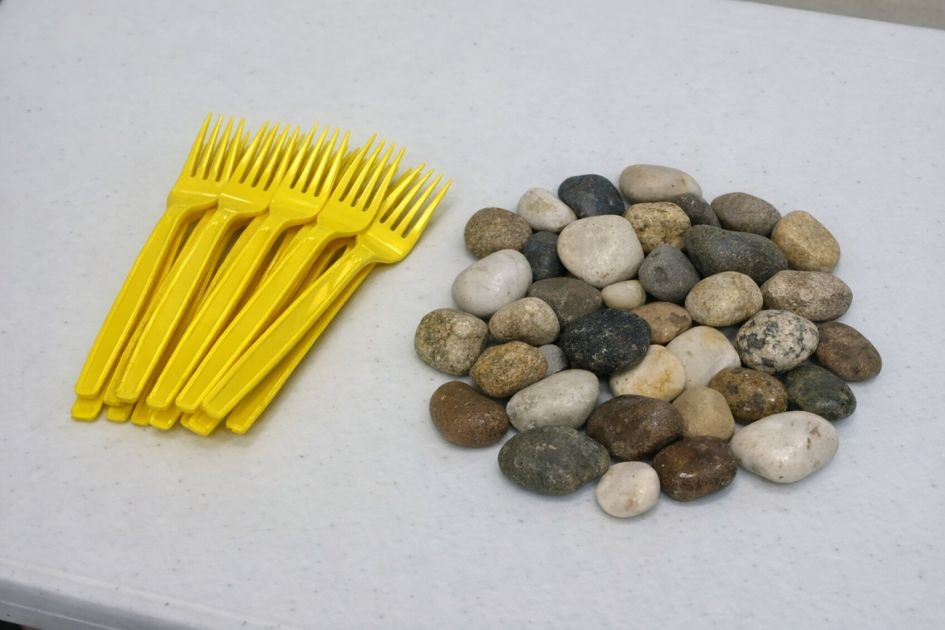 3. Using the heat source, gently heat the handles of the bright yellow plastic forks until they become pliable.