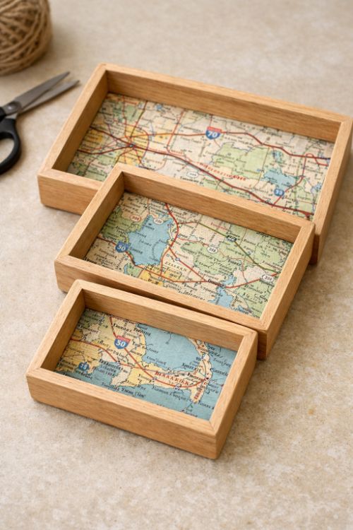 Place the finished trays on a coffee table or sideboard, where they can complement both modern and rustic decor styles. The vintage map patterns add an eclectic touch, especially in spaces with neutral or earth-toned palettes. Pair the trays with other travel-themed decor items or wooden accents to enhance their nostalgic appeal.