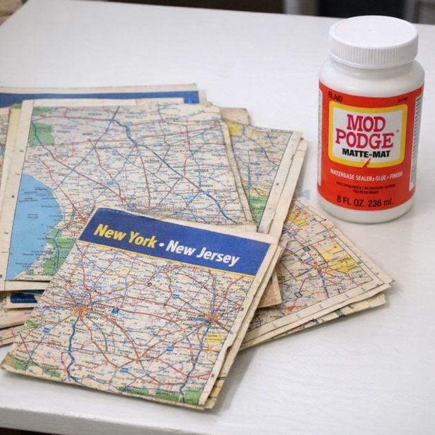 Once all maps are adhered, apply another layer of mod podge over the top of each map to seal it.