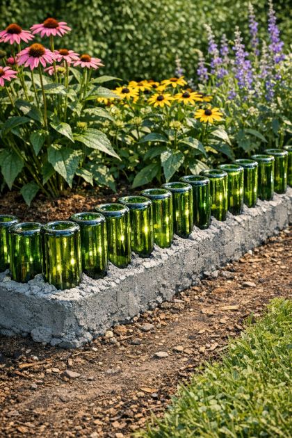 The finished DIY garden border should be styled to complement natural greenery and floral arrangements in your yard. Place it around flower beds, vegetable gardens, or as an edging for pathways. The green glass bottles will pair well with lush foliage and vibrant blooms, while the gray concrete provides a neutral backdrop that allows the glass to stand out. Consider adding solar lights nearby to enhance the shimmering effect at night.