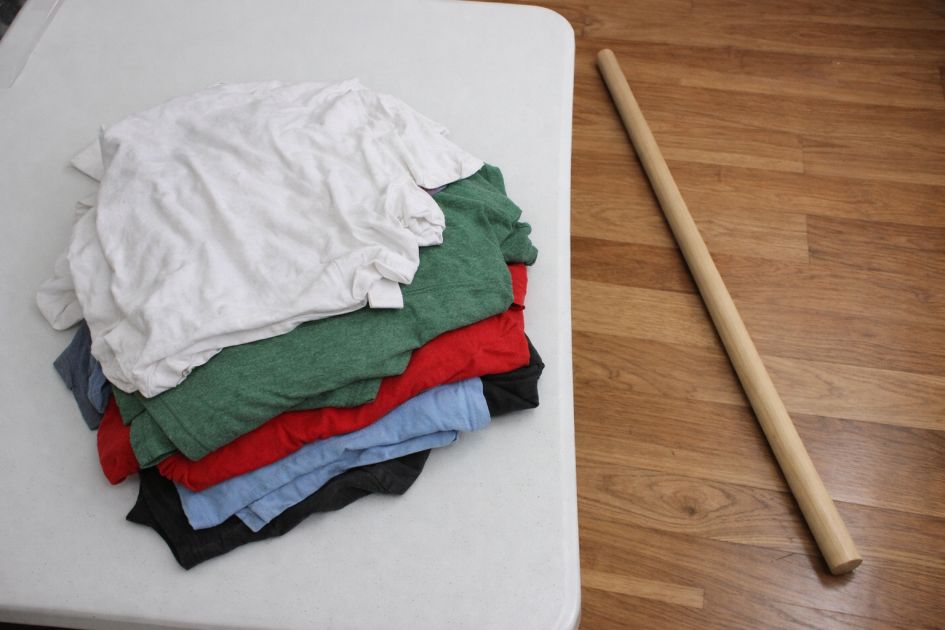 Cut each t-shirt into long strips, approximately 2 inches wide. Remove any seams or hems.