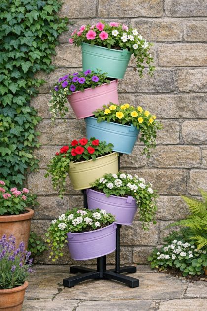 Place the tiered planter against a garden wall or as a focal point on a patio. Coordinate the bucket colors with the surrounding decor for a harmonious look. Consider using pastel or earth tones for the buckets to complement a natural setting. Add decorative stones or mulch at the base of each bucket for a polished finish. Incorporate plants with varying heights and colors to create depth and interest. The planter can also be styled indoors near a sunny window with herbs or small flowers for a fresh, vibrant touch.