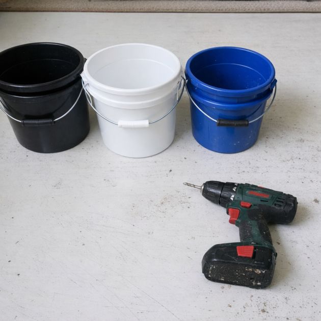 Drill four evenly spaced holes around the rim of each bucket using the electric drill and 1/2-inch drill bit. These will be used for drainage and alignment.