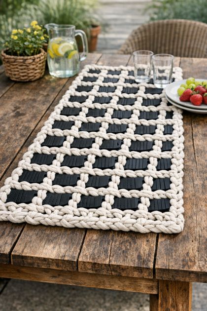 This innovative DIY project combines the beauty of crochet with sustainable practices by repurposing old rubber car floor mats. By weaving thick white cotton yarn through the cut-up mats, you create a unique, textured table runner perfect for outdoor spring settings. This project not only gives new life to discarded materials but also provides an eye-catching conversation piece that adds a touch of handmade charm to your table decor.
