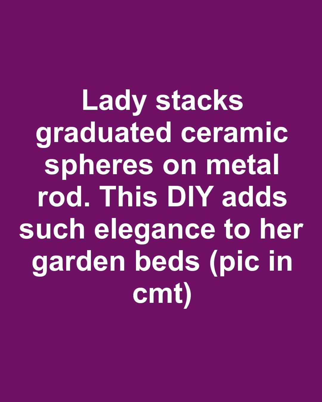 Lady stacks graduated ceramic spheres on metal rod. This DIY adds such elegance to her garden beds